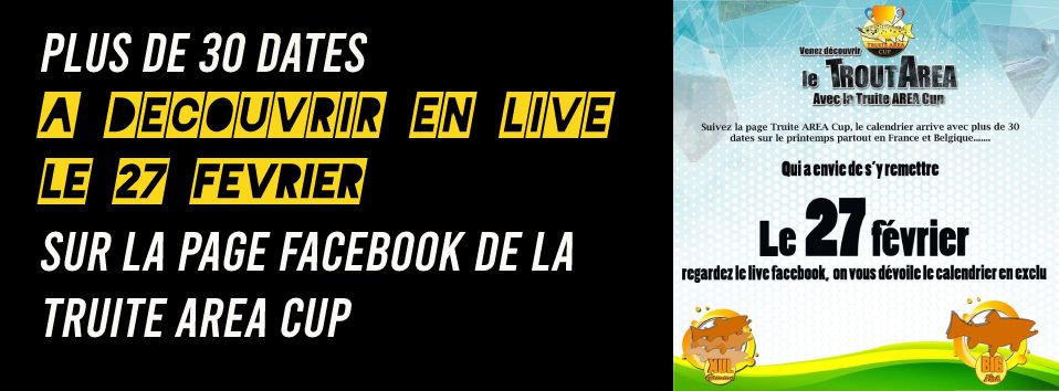 Rendez vous le 27 Février avec un live Facebook. Guillaume VERNET, l'organisateur de la Truite Area Cup vous dévoilera le calendrier et les toutes dernières nouveautés !