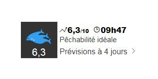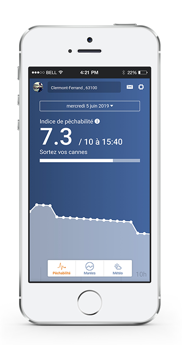 L’indice de pêchabilité vous permet de connaître, en temps réel, le meilleur moment pour aller pêcher, quel que soit l'endroit où vous vous trouvez. Mis à jour toutes les 3 minutes, il vous indique, pour chaque commune de France et par une note de 0 à 10, la probabilité de faire une bonne pêche.