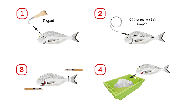 Tout droit venu du Japon, l’ike jime (活け締め) est une technique traditionnelle de mise à mort instantanée du poisson, c’est-à-dire dès sa sortie de l’eau. Pour cela, le pêcheur insère manuellement une tige métallique entre les deux yeux du poisson. Contrairement à la suffocation passive, qui produit des réactions biochimiques, biophysiques et hormonales négatives, l’ike jime préserve la qualité de la chair.