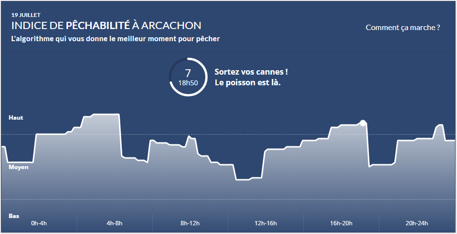Pour vous aider à partir au meilleur moment de la journée, nous avons créé pour vous un algorithme "temps réel" prenant en compte tous les paramètres mathématiques et scientifiques qui influencent le comportement du bar : les marées, la météo, la température de l'eau, la houle, le courant...